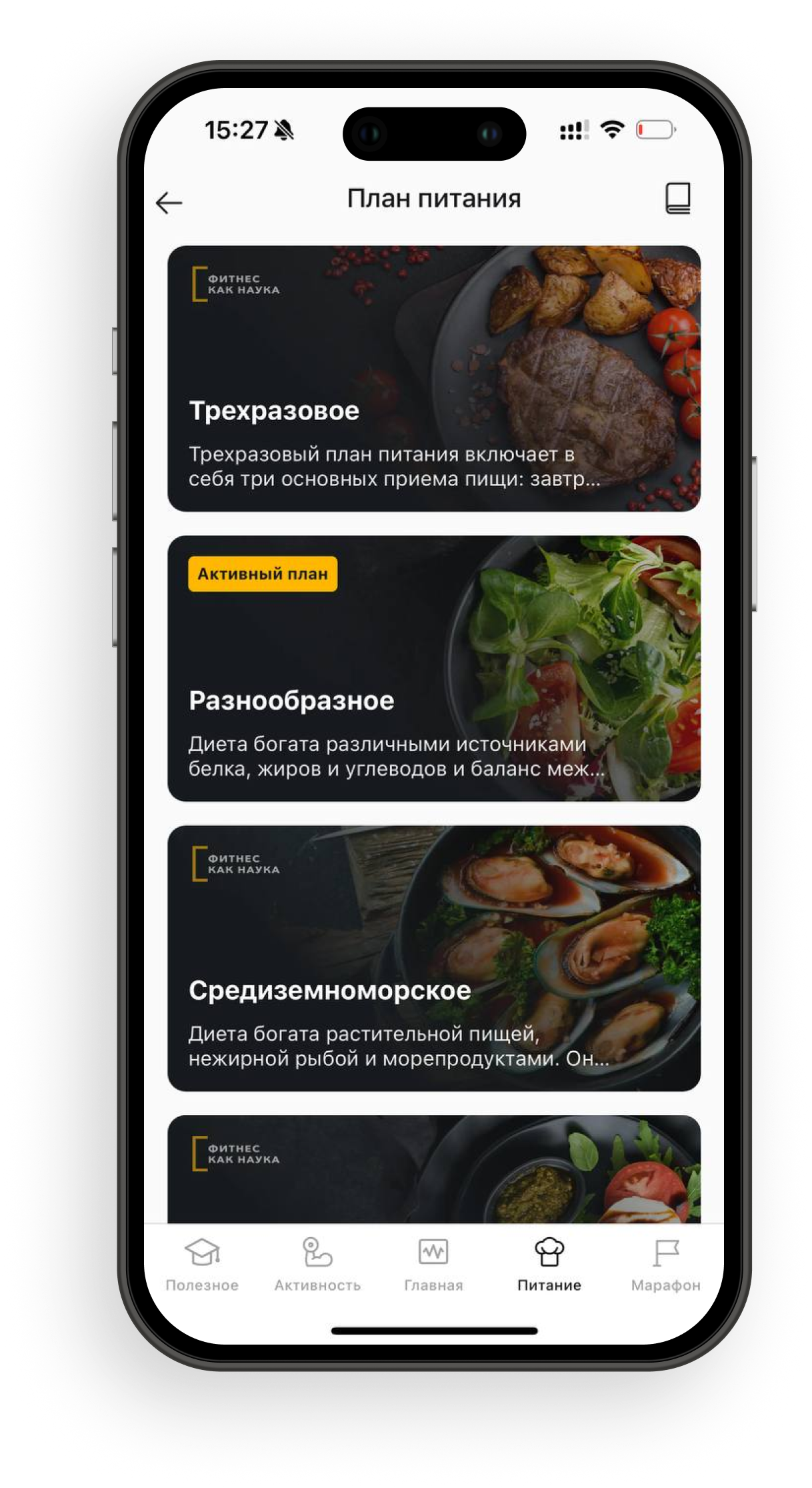 Супер приложение с тренировками, отслеживанием питания и статьями.